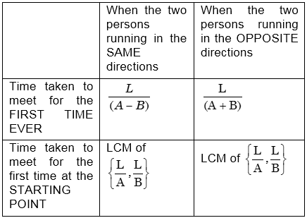 When two persons are running around a circular tack in the SAME direction the relative speed is equal to the difference of the speeds of the two individuals and from one meeting point to the next meeting point, the faster person covers one COMPLETE ROUND more than the slower person. We can now tabulate the time taken by the persons to meet for the first time ever or for the first time at the starting point in various cases.