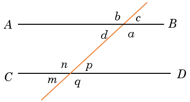 \(b = a\), \(c = d\), \(n = q\), \(m = p\) (Vertically opposite angles)