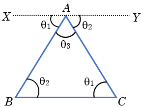 The sum of the internal angles in a triangle is always 180°. Suppose ABC is a triangle, whose internal angles are \({\theta _1},{\theta _2}\) and \({\theta _3}.\) Draw a line parallel to BC and passing through A, then