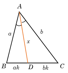 Suppose in the triangle \(ABC\),\(\angle BAD = \angle DAC = \theta \), now \(\frac{{AB}}{{AC}} = \frac{{BD}}{{DC}}\), suppose \(AB\) and \(AC = a, b\), then \(BD\) and \(DC\) are in the ratio of \(a\) and \(b\).