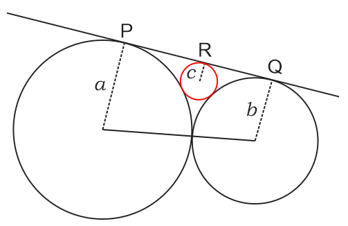Example 02: There are three circles of radii \(a,\,b\) and \(c\) such that circles with radii \(a,\;b\) touch each other externally and circle with radius \(c\) touches both the circles
