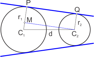 Using the Pythagorean Theorem, the length of the direct common tangent\[\bbox[5px, border:1px solid blue]{C_2M = PQ = \sqrt{{d^2 - (r_1 - r_2)^2}}}\]