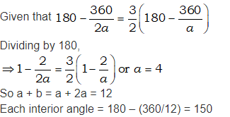 Question 11: Let A and B be two regular polygons having a and b sides, respectively. If b = 2a and each interior angle of B is 3/2 times each interior angle of A, then each interior angle, in degrees, of a regular polygon with a + b sides is: