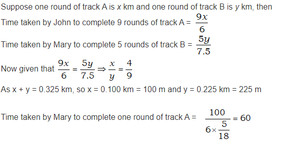 Question 14: John jogs on track A at 6 kmph and Mary jogs on track B at 7.5 kmph. The total length of tracks A and B is 325 metres. While John makes 9 rounds of track A, Mary makes 5 rounds of track B. In how many seconds will Mary make one round of track A?