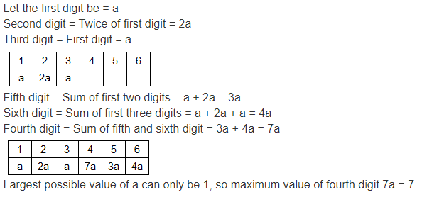 Question 29: In a six-digit number, the sixth, that is, the rightmost, digit is the sum of the first three digits, the fifth digit is the sum of first two digits, the third digit is equal to the first digit, the second digit is twice the first digit and the fourth digit is the sum of fifth and sixth digits. Then, the largest possible value of the fourth digit is: