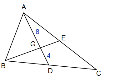 We know that all the medians intersect at centroid G, and divide each other in the ratio 2 : 1, hence AG = 8 and GD = 4. Also given that AD is perpendicular to BE.