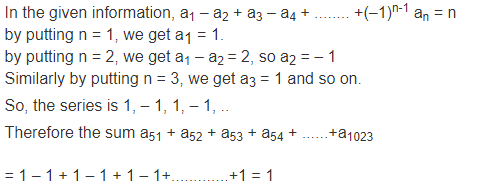Question 05: Let a1, a 2, a3, ..... be integers such that a1 – a2 + a3 – a 4 + ........ +(–1)n-1 an = n , for n ≥ 1. Then a51 + a52 + ........ + a1023 equals: