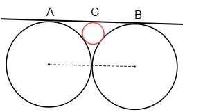 Given that circles are touching externally, so AB will be the length of direct common tangent of the two bigger circles.