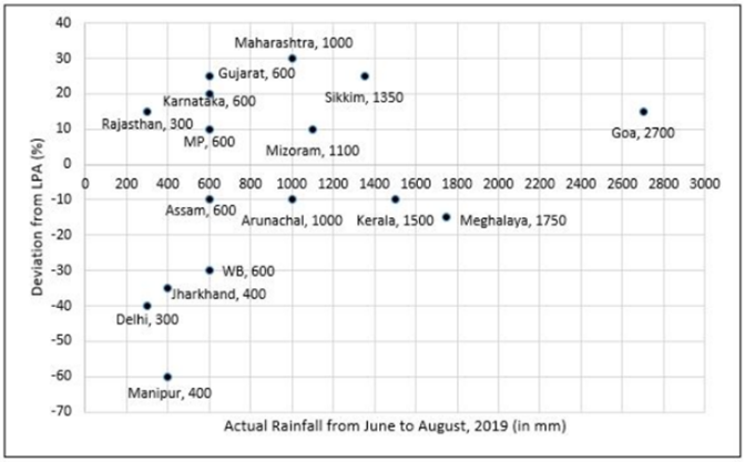 June-August, 2019 and the percentage deviations from LPA of respective states in 2018. Each state along with its actual rainfall is presented in the figure.