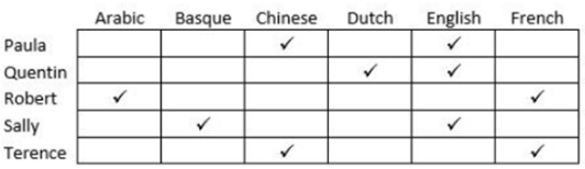 In the table below the check marks indicate all languages spoken by five people: Paula, Quentin, Robert, Sally and Terence. For example, Paula speaks only Chinese and English.