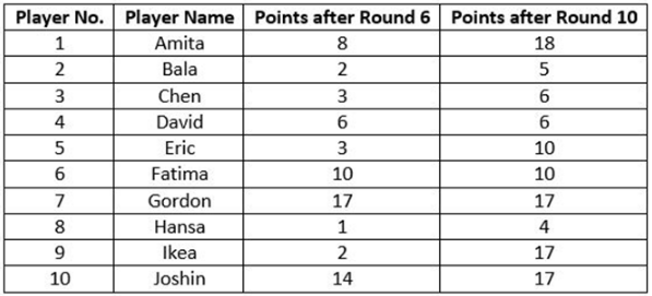 The top three performances in each round were awarded 7, 3 and 1 points respectively. There were no ties in any of the 10 rounds. The table below gives the total number of points obtained by the 10 players after Round 6 and Round 10.