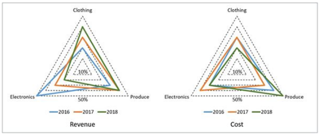 A large store has only three departments, Clothing, Produce, and Electronics. The following figure shows the percentages of revenue and cost from the three departments for the years 2016, 2017 and 2018. The dotted lines depict percentage levels. So for example, in 2016, 50% of store's revenue came from its Electronics department while 40% of its costs were incurred in the Produce department.
