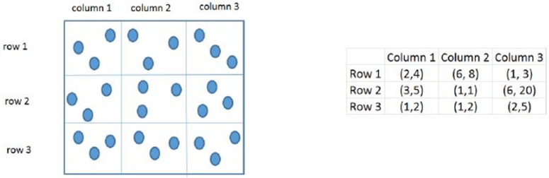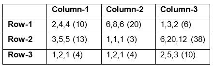 in each of the nine slots are given in the table. For example, we know that among the three pouches kept in the second column of the first row, the minimum amount in a pouch is Rs. 6 and the maximum amount is Rs. 8.