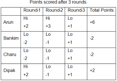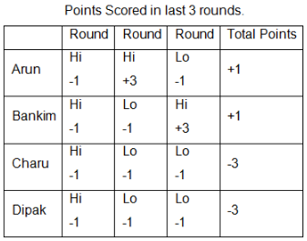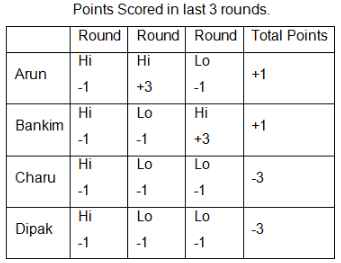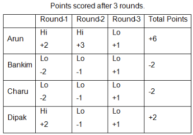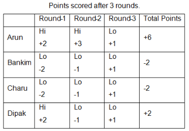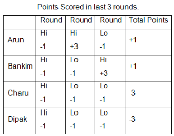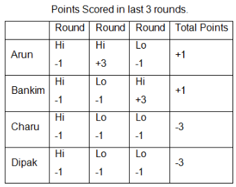 At the end of three rounds, the sum of points scored by all the four players together is 6 – 2 – 2 + 2 = 4. It means in first three rounds, exactly one time all four of them bade Lo and each of them scored +1 point. The total score of Arun at the end of three rounds is 6 points. He must have scored +1, +2 and +3 points. So in one round all four players bade Lo, in another round he and one more player bade Hi and in one round he alone bade Hi.