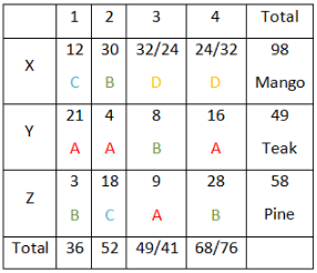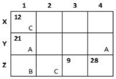 The plots in rows X, Y, Z contained mango, teak and pine trees respectively. Each plot had trees in non-zero multiples of 3 or 4 and none of the plots had the same number of trees. Each daughter got an even number of plots. In the figure, the number mentioned in top left corner of a plot is the number of trees in that plot, while the letter in the bottom right corner is the first letter of the name of the daughter who got that plot (For example, Abha got the plot in row Y and column 1 containing 21 trees). Some information in the figure got erased, but the following is known: