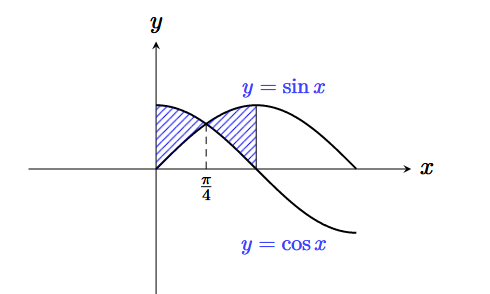 The curves \(y = \sin x\) and \(y = \cos x\) intersect when \(\sin x = \cos x\), which gives \(x = \dfrac{\pi}{4}\).