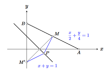 The distance \(PM'=PM=\sqrt{\left(\dfrac{4}{3} - 2\right)^2 + \left(-\dfrac{1}{3} - -1\right)^2}\)